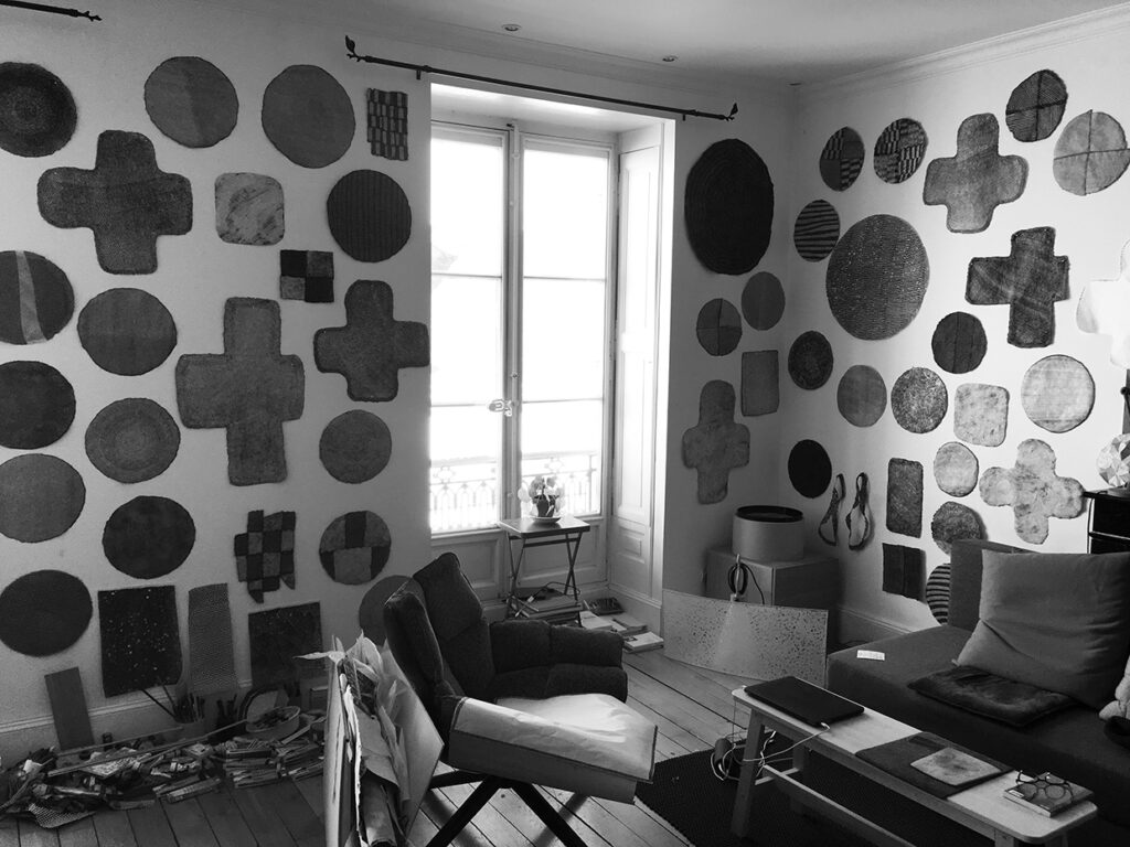 Dans mon logement-atelier, les œuvres sont dans tous les lieux, dans la chambre, l’entrée, mais surtout dans le salon où j’ai mon espace de travail. J’ai deux tables sur lesquelles je dessine, car je ne le fais jamais au mur, mais assis ou debout, au-dessus de mon support. Ma façon de travailler fait que certaines pièces apparaissent au verso, et je les découvre à la fin. J’aime ce travail en aveugle, le fait de ne pas avoir de vision d’ensemble au moment où je dessine, mais la révéler après.